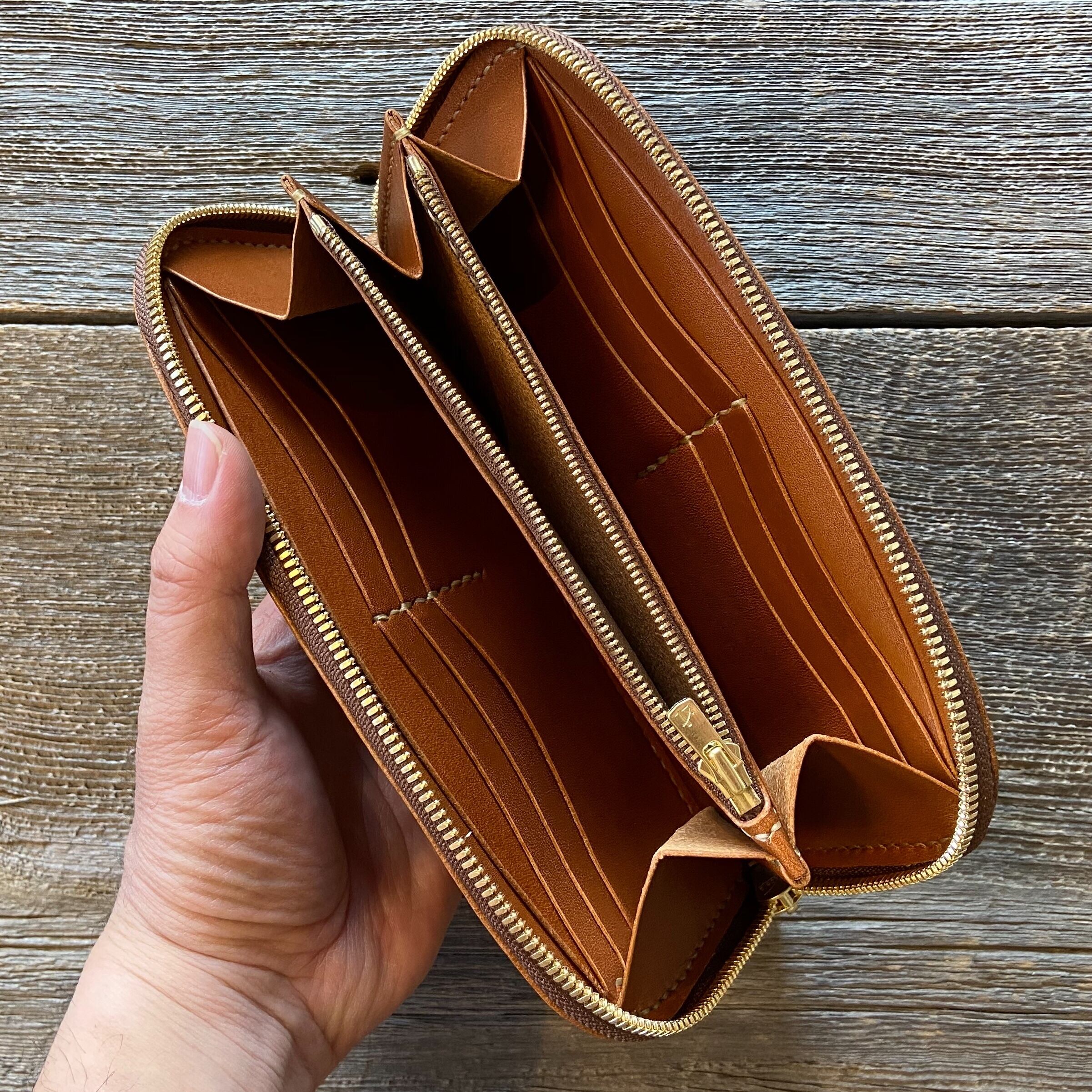 イギリスで見た本物の王冠にインスピレーションを受け、王冠のシルエットを意識して仕立てた、少し丸みのあるジップロングウォレットです。一般的な長財布より柔らかなラインを持たせることで、デザイン性だけでなく、ファスナーの開閉もより滑らかになりました。