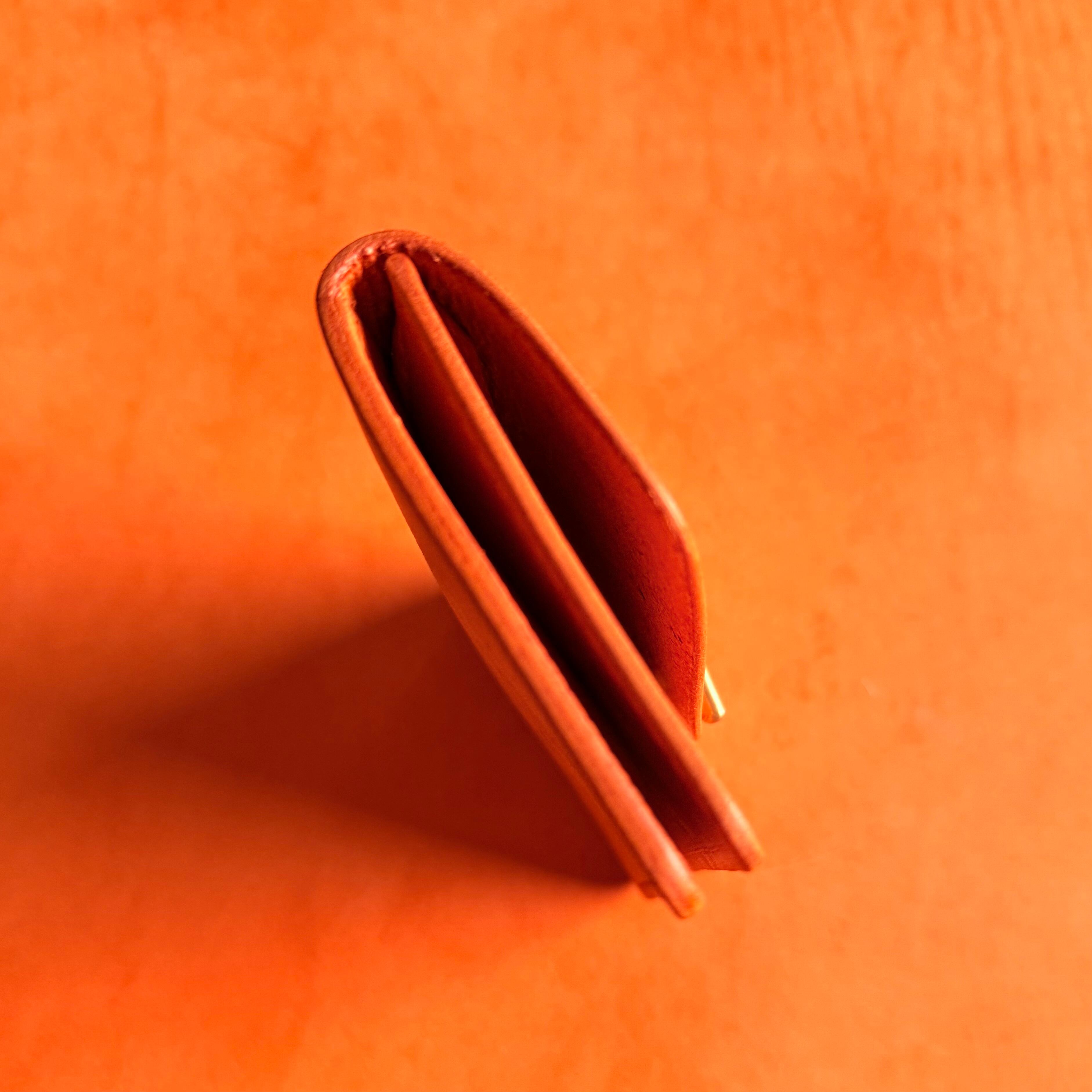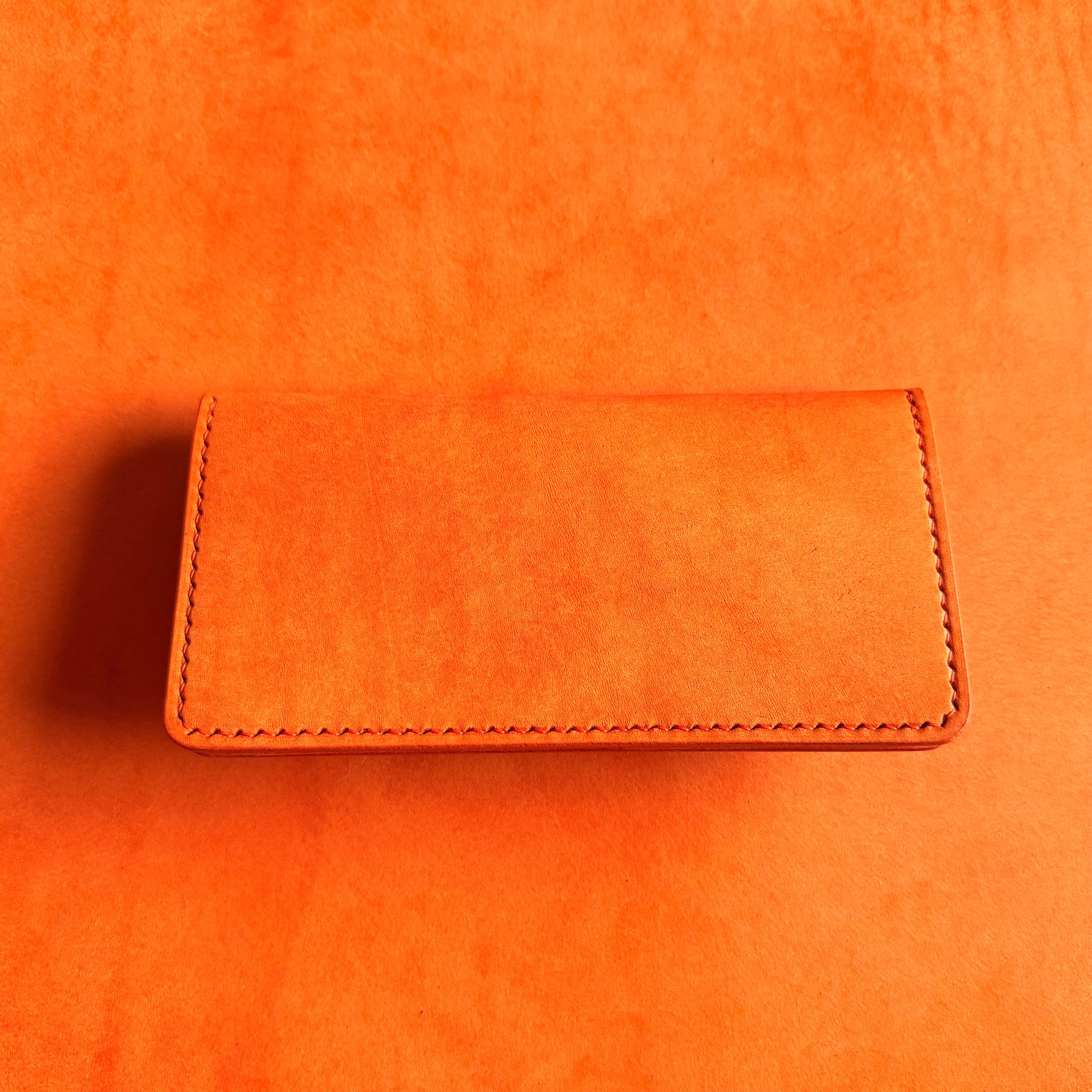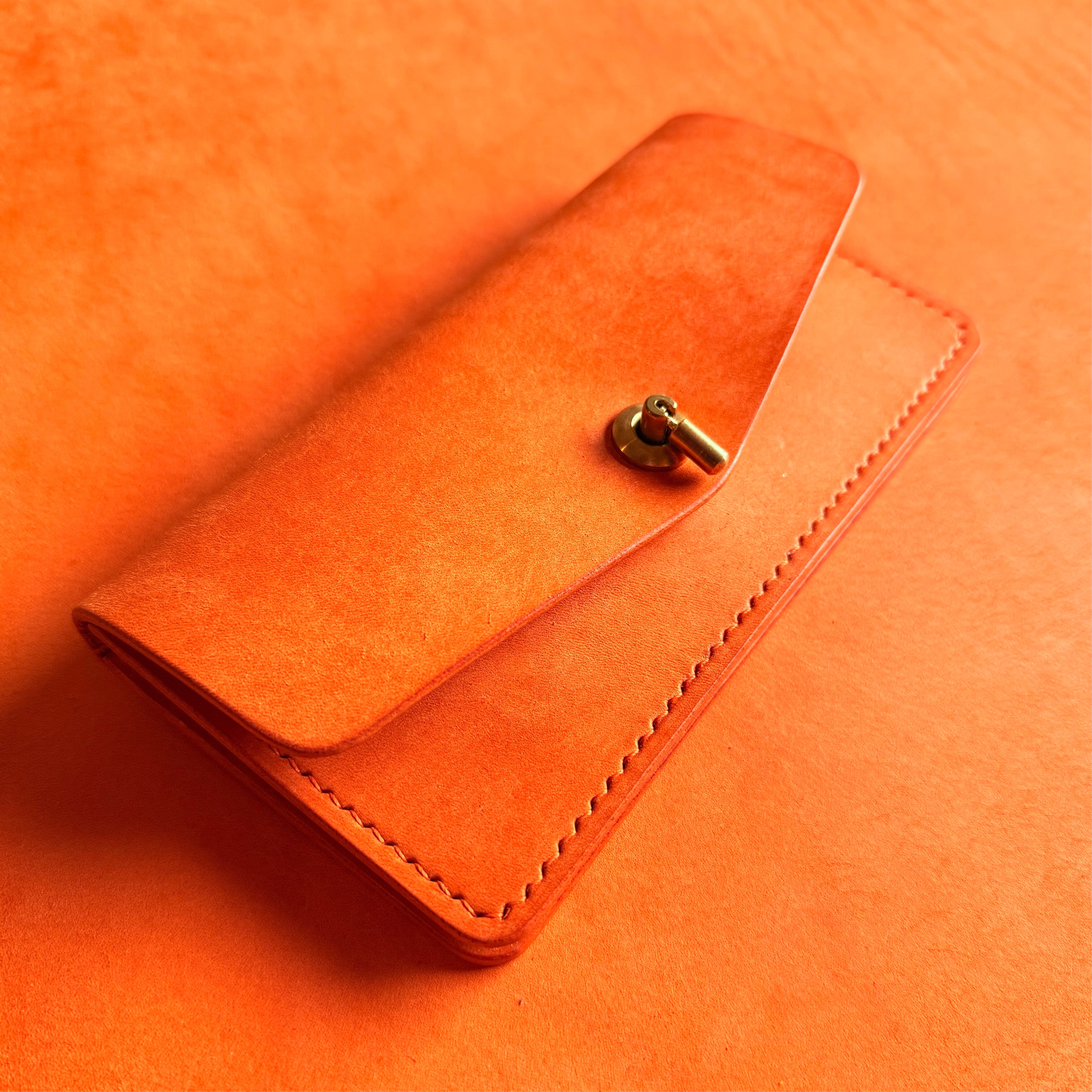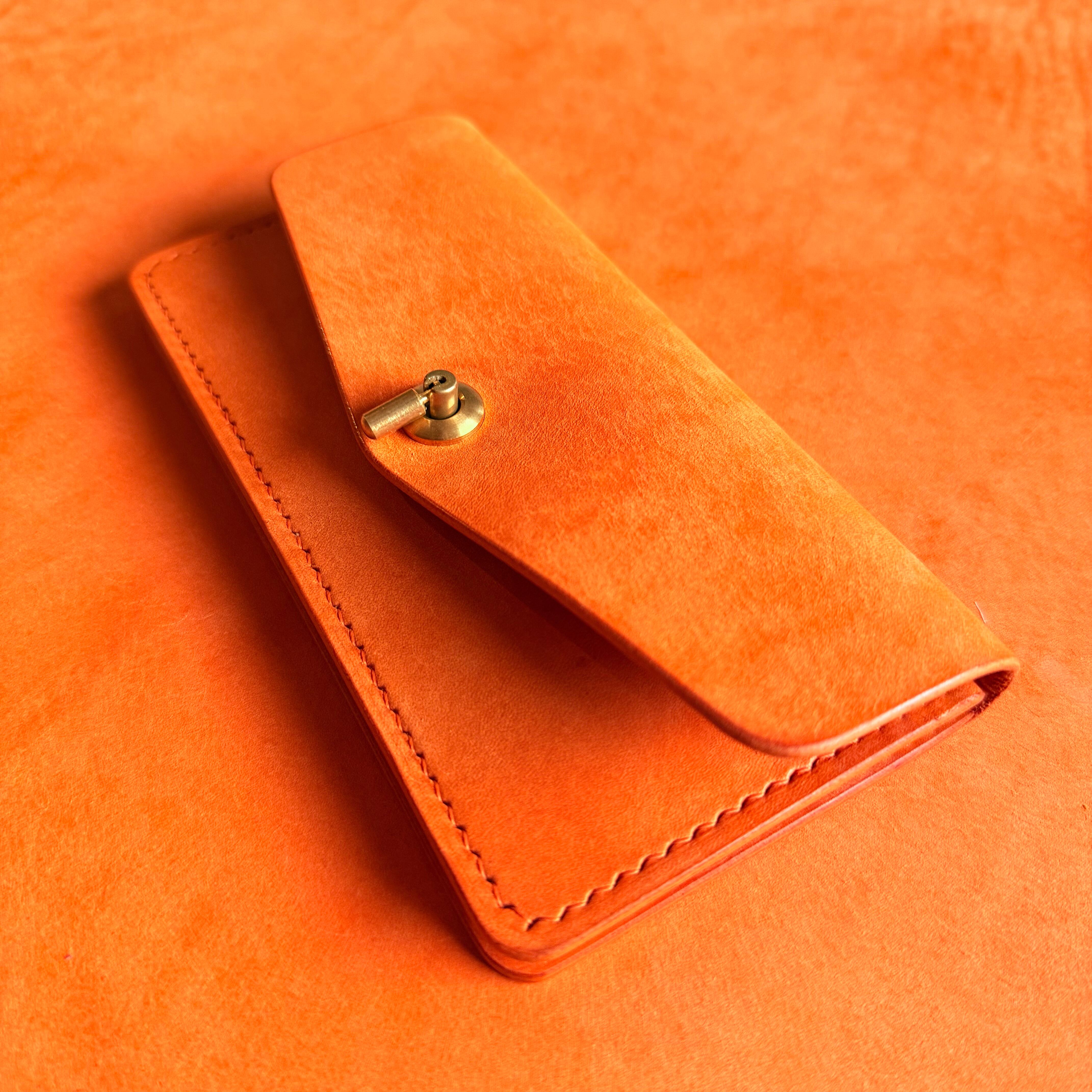 メンズに人気のトラッカーズウォレットの蛇腹ポケット構造を活かしつつ、フラップをハトメオコシで留める仕様にすることで、薄さと上品さを兼ね備えた長財布に仕上げました。