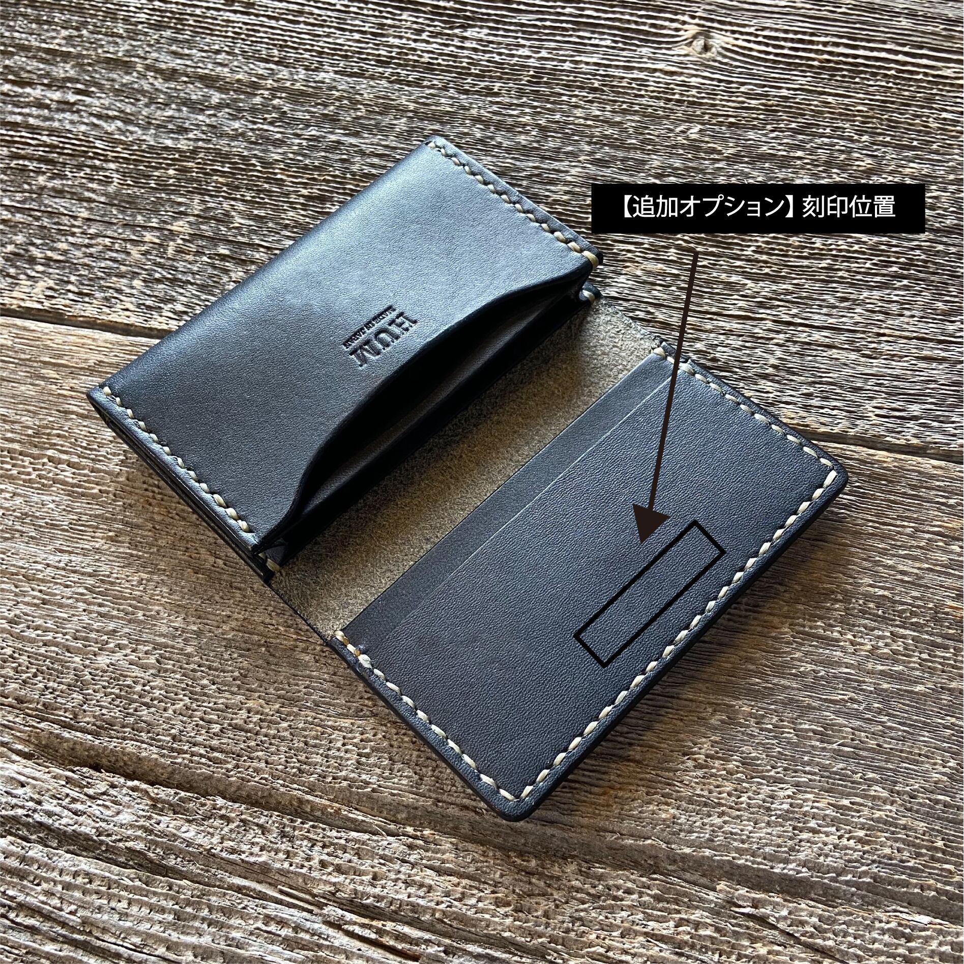 通常は画像の位置にHUMのロゴが入りますが、ご希望に応じて表側への刻印も可能です。